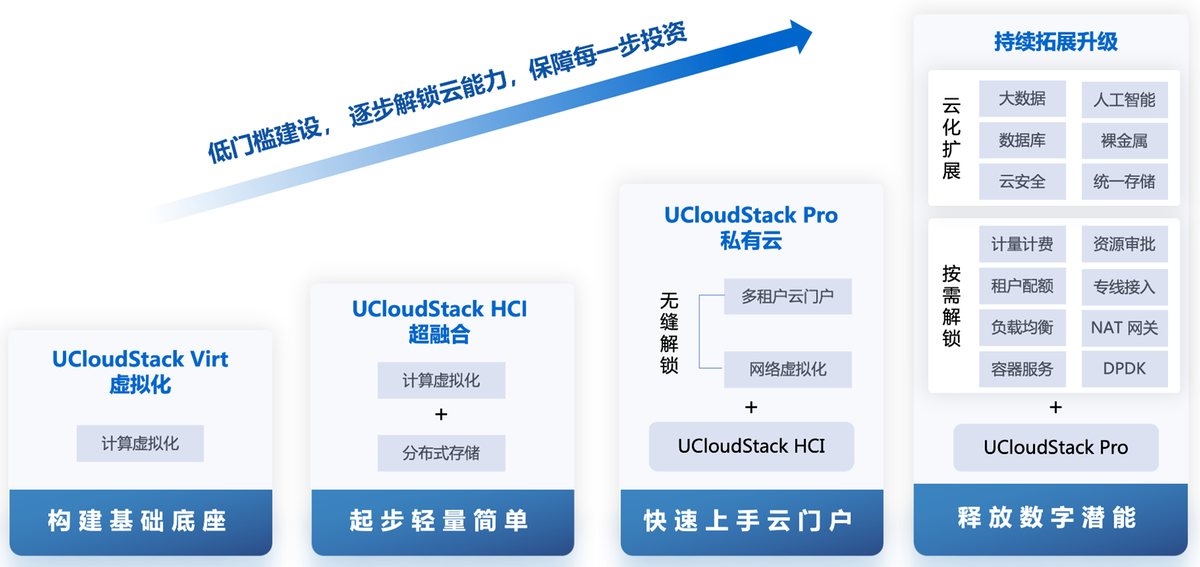 从低门槛构建虚拟化基础底座,到起步轻量简单的超融合,再到无缝解锁包括容器等在内的全栈私有云能力,UCloudStack可提供完整的云化演进路径,为企业数字化转型的每一步投资提供保障,更好地适应不断变化的技术环境和政策法规。
