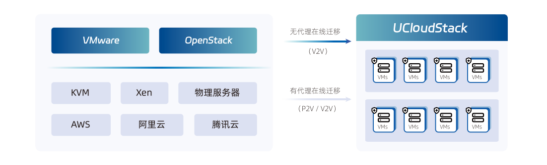 平台的切换势必将面临系统迁移问题,UCloudStack提供异构环境平滑迁移能力,支持VMware和OpenStack的无代理在线迁移,并支持KVM、物理服务器和主流公有云的 有代理在线迁移,可保障业务不中断的情况下进行在线迁移。